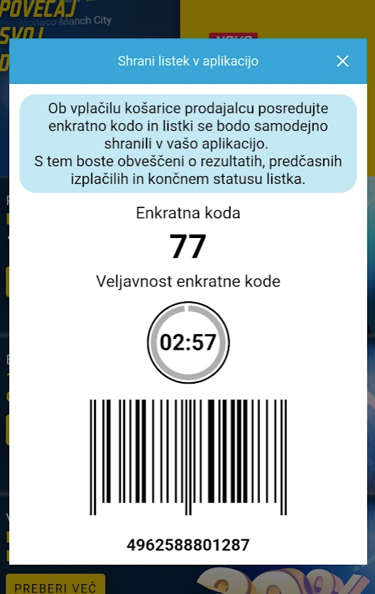 - Ob vplačilu košarice na blagajni obvestite prodajalca, da želite listke povezati z enkratno kodo za obveščanje. Ob vplačilu lahko to kodo skenira iz vaše aplikacije ali pa mu poveste enkratno kodo, katero ročno vpiše v stavnico.