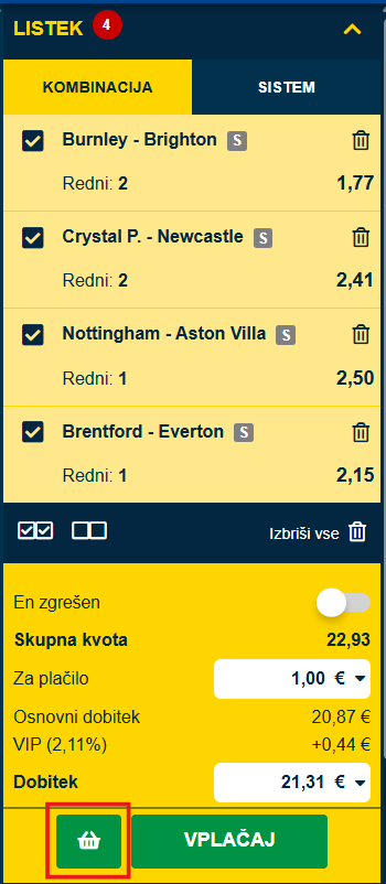 Ko na listek dodate vsebino, ki ste jo želeli vplačati (stavo, napoved, številke,…) ter določili znesek vplačila, potem na dnu listka izberite gumb z narisano košarico. S tem bo listek dodan na seznam v košarico.