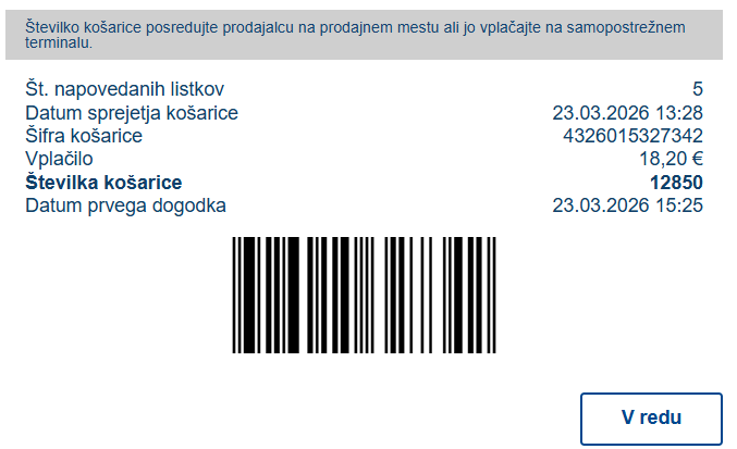 - na prodajnem mestu – prodajalcu posredujete kratko številko košarice ali črtno kodo in ta vam bo po izvršenem plačilu, izročil izpisane listke, ki ste jih imeli v košarici.
